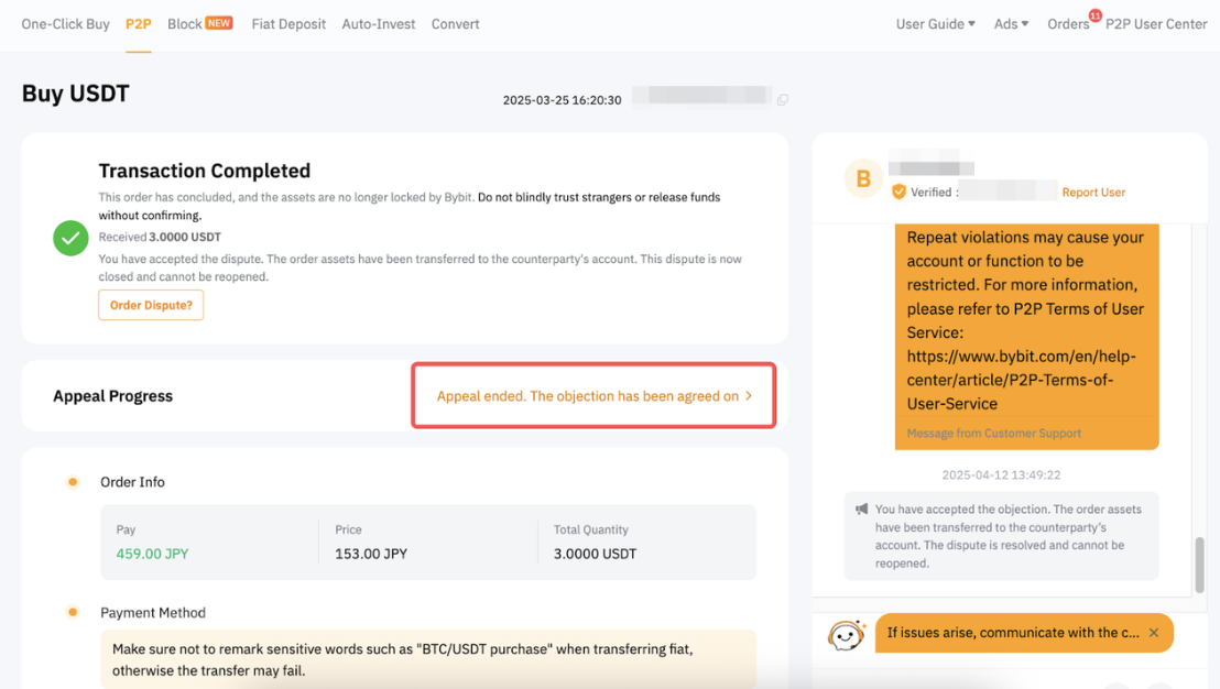 Frequência do recurso: Uma ordem P2P em andamento pode ser contestada até 2 vezes, enquanto uma ordem cancelada ou finalizada podeser contestada até 3 vezes após o cancelamento ou conclusão. Nenhum outro recurso pode ser apresentado após a equipe de recurso P2P tomar a decisão final. Um usuário pode enviar até 10 recursos de ordens canceladas ou concluídas e até 4 recursos de ordens em andamento por dia.