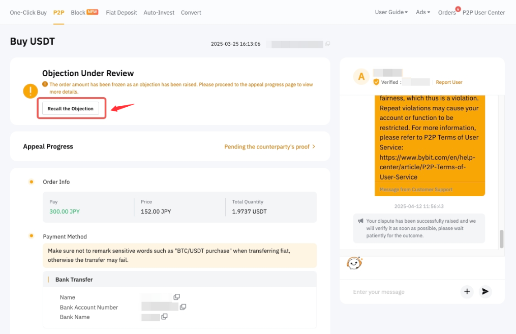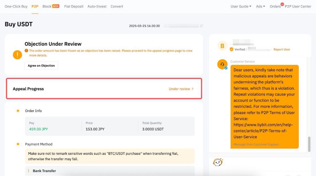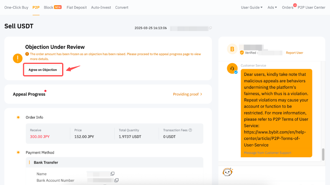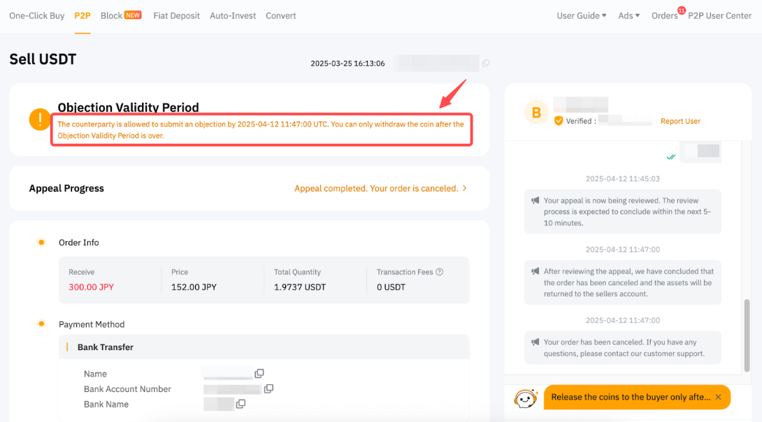 Quando uma objeção é levantada dentro do período congelado, o especialista em recursos P2P entrará no chat para verificar sua prova após o fim do cronômetro de contagem regressiva.
