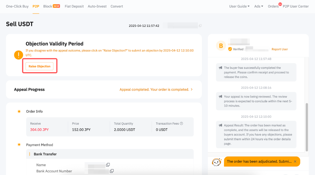 Após o julgamento, o valor da ordem será congelado por um período correspondente, com base no status de trading da ordem após a conclusão do recurso, para que a contraparte confirme o resultado. Você pode verificar o tempo de descongelamento do ativo na página de ordens.