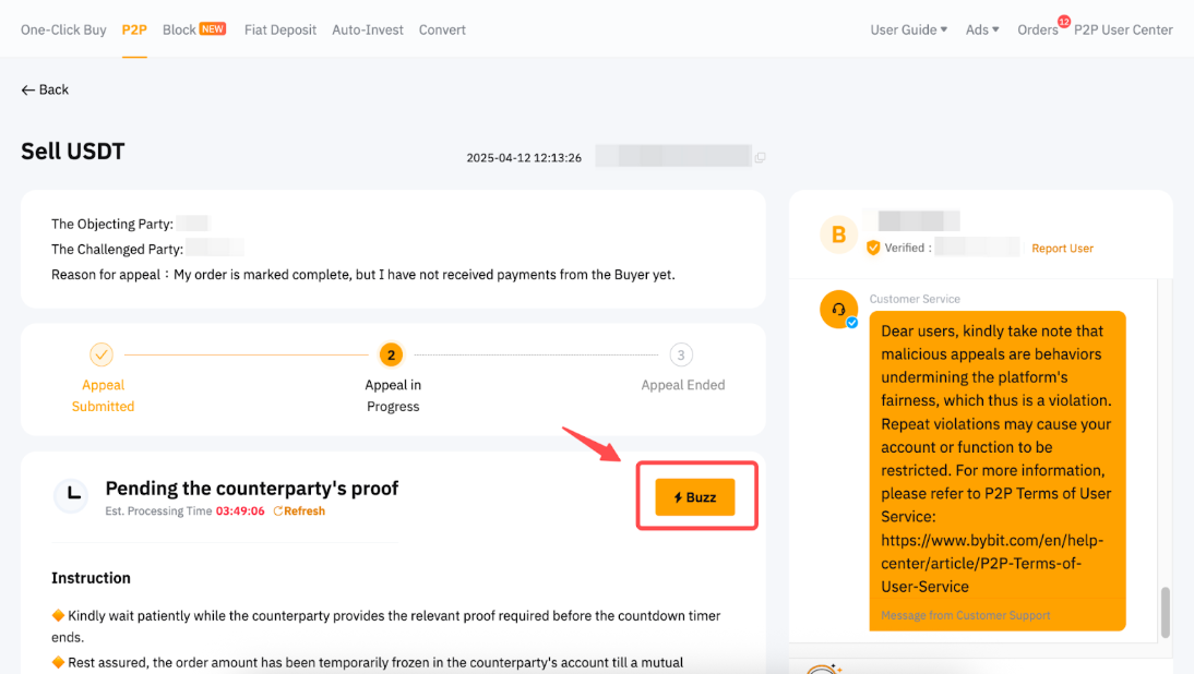 Para os recorrente, se a disputa não for resolvida após a negociação ou se você não receber uma resposta do entrevistado, o especialista P2P entrará no chat e fornecerá assistência adicional após o término do timer de contagem regressiva. Certifique-se de enviar suas evidências de acordo com nossos requisitos para garantir um processo tranquilo.