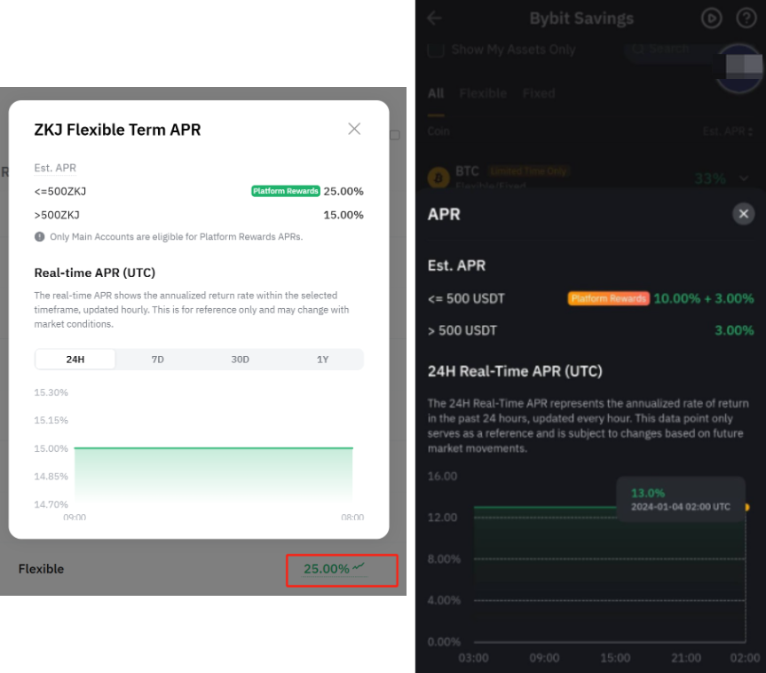 Os produtos de Prazo flexível oferecem taxas de juros por níveis com base no valor dos ativos que você investe. A APR varia de acordo com o nível e pode mudar dependendo das condições do mercado. No site da Bybit, uma APR escalonada é indicada por um sublinhado pontilhado, enquanto no aplicativo da Bybit, ela aparece em laranja.