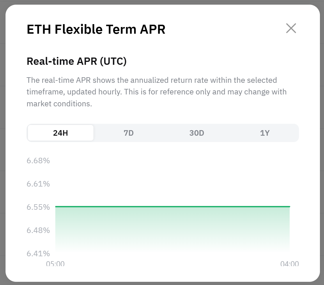Observe que a APR é uma estimativa e pode não refletir o retorno exato que você receberá. Você pode visualizar a APR das últimas 24 horas, 7 dias, 30 dias ou 1 ano no gráfico.