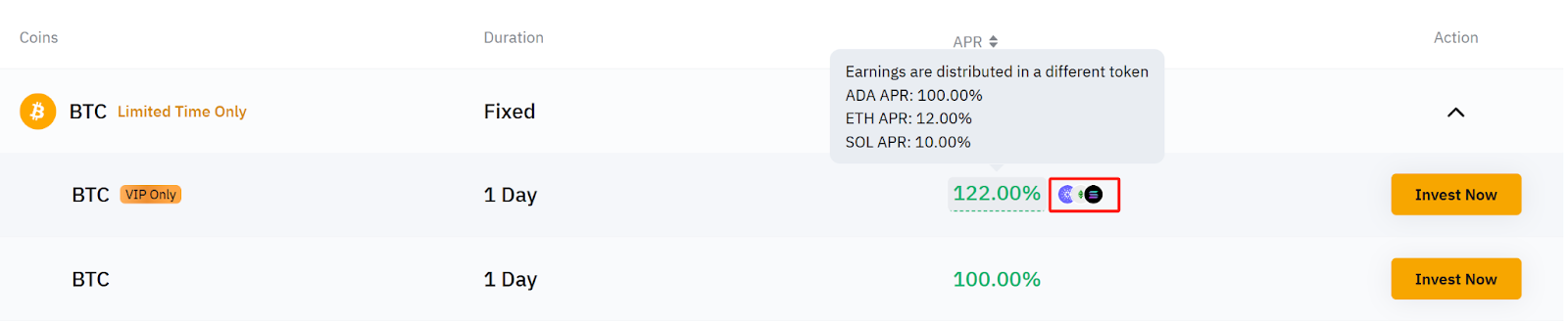 Alguns planos de Prazo fixo permitem que você obtenha rendimentos em uma ou mais moedas diferentes daquela em que investiu, lhe ajudando a diversificar suas recompensas sem nenhum esforço extra. Por exemplo, ao investir em BTC, você pode ganhar recompensas em BTC, ETH e USDT.