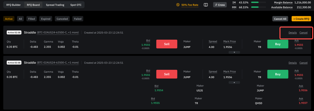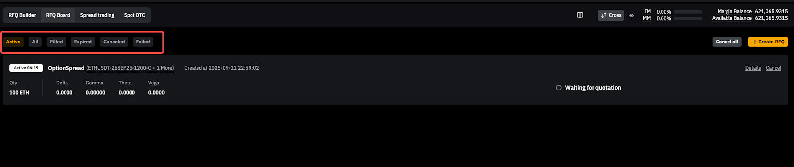 Na parte inferior da página de trading de RFQ, você encontrará: