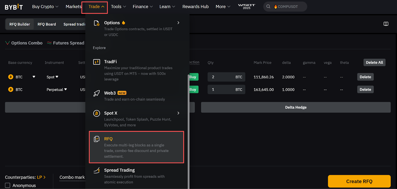 1º passo: Faça login no site da Bybit e clique em Trade → RFQ na barra de navegação para ir para a página RFQ.