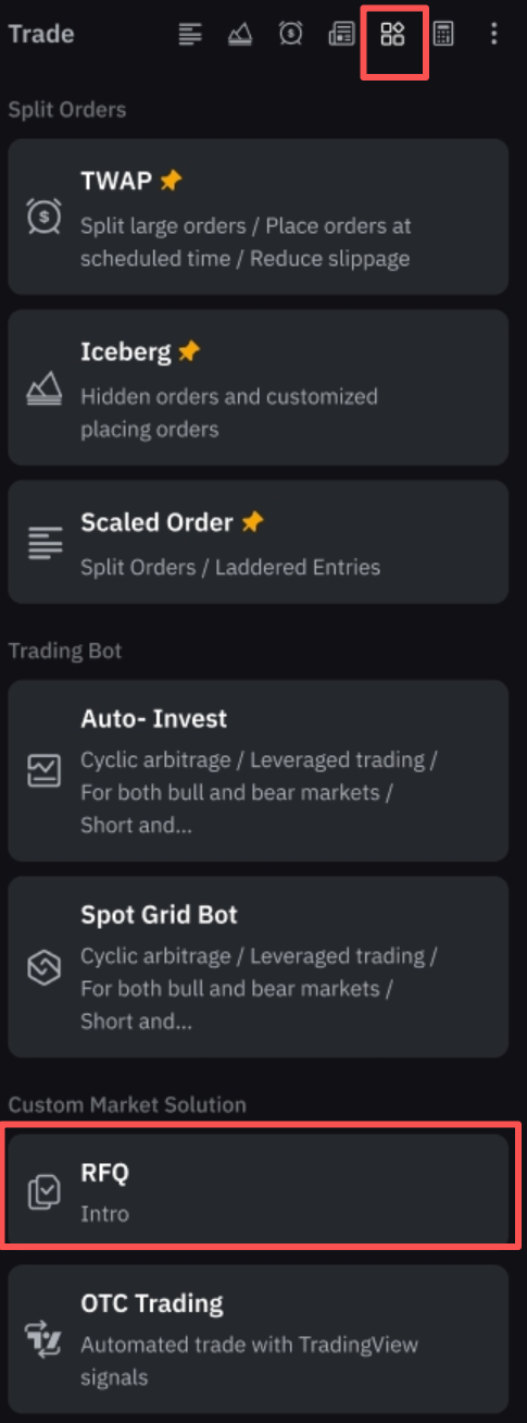 Você também pode acessar a RFQ na página de trading em Spot/de Futuros clicando no ícone de Ferramentas no painel de Trade à direita.