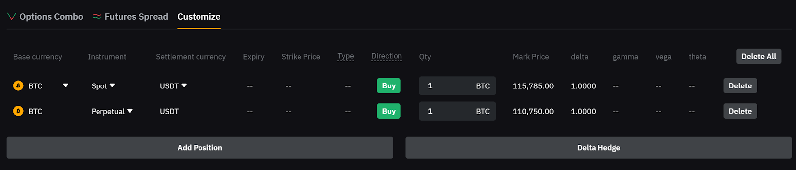 5º passo: Selecione a moeda base/de liquidação e o instrumento nos menus suspensos e insira a quantidade. Para remover uma etapa, basta clicar em Excluir no lado direito ou em Excluir tudo para redefinir tudo.