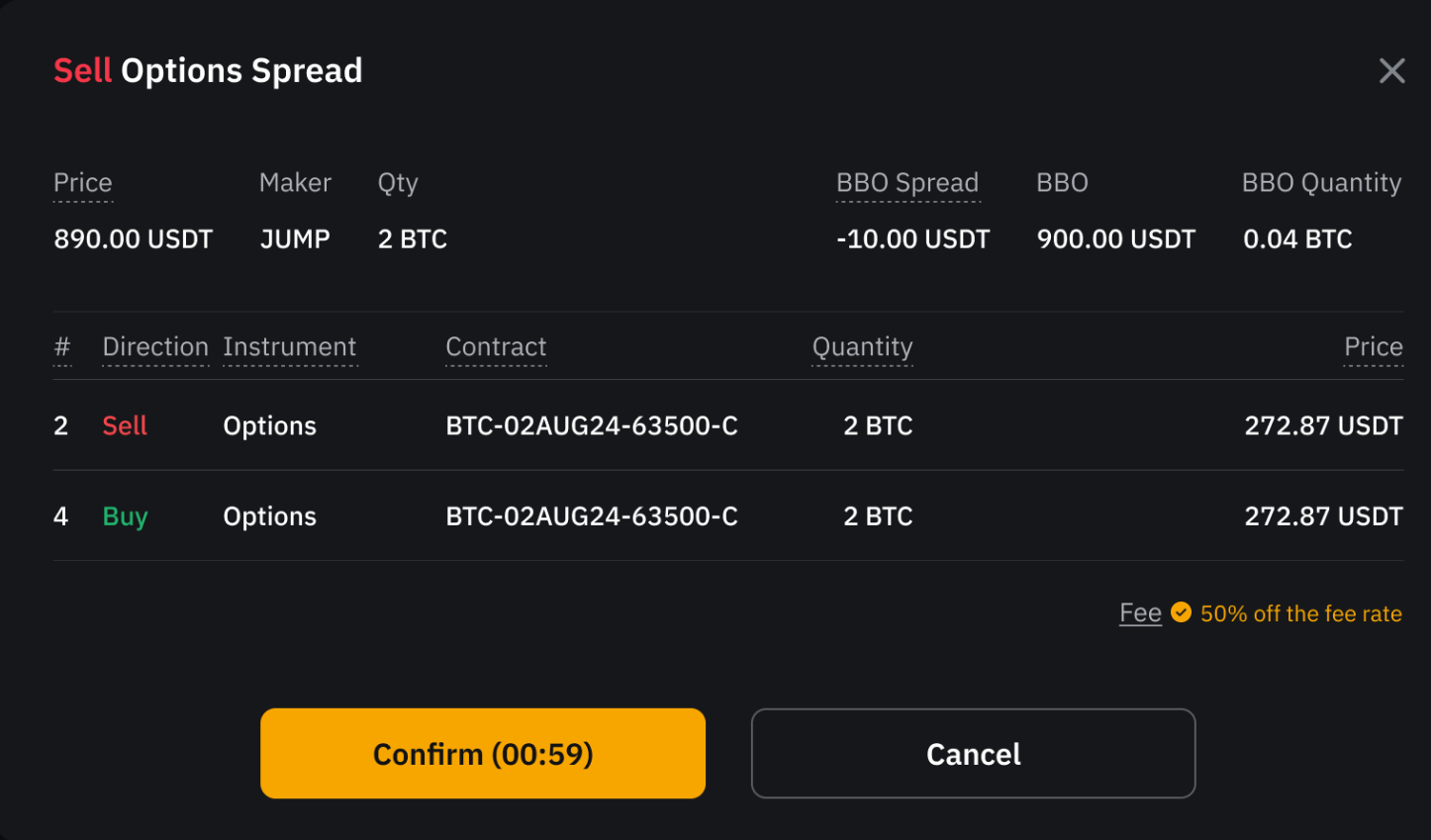 3º passo: Uma janela de confirmação será exibida. Revise os detalhes da cotação, incluindo preço, Maker e quantidade, depois clique em Confirmar para executar o trade ou clique em Cancelar para descartar.