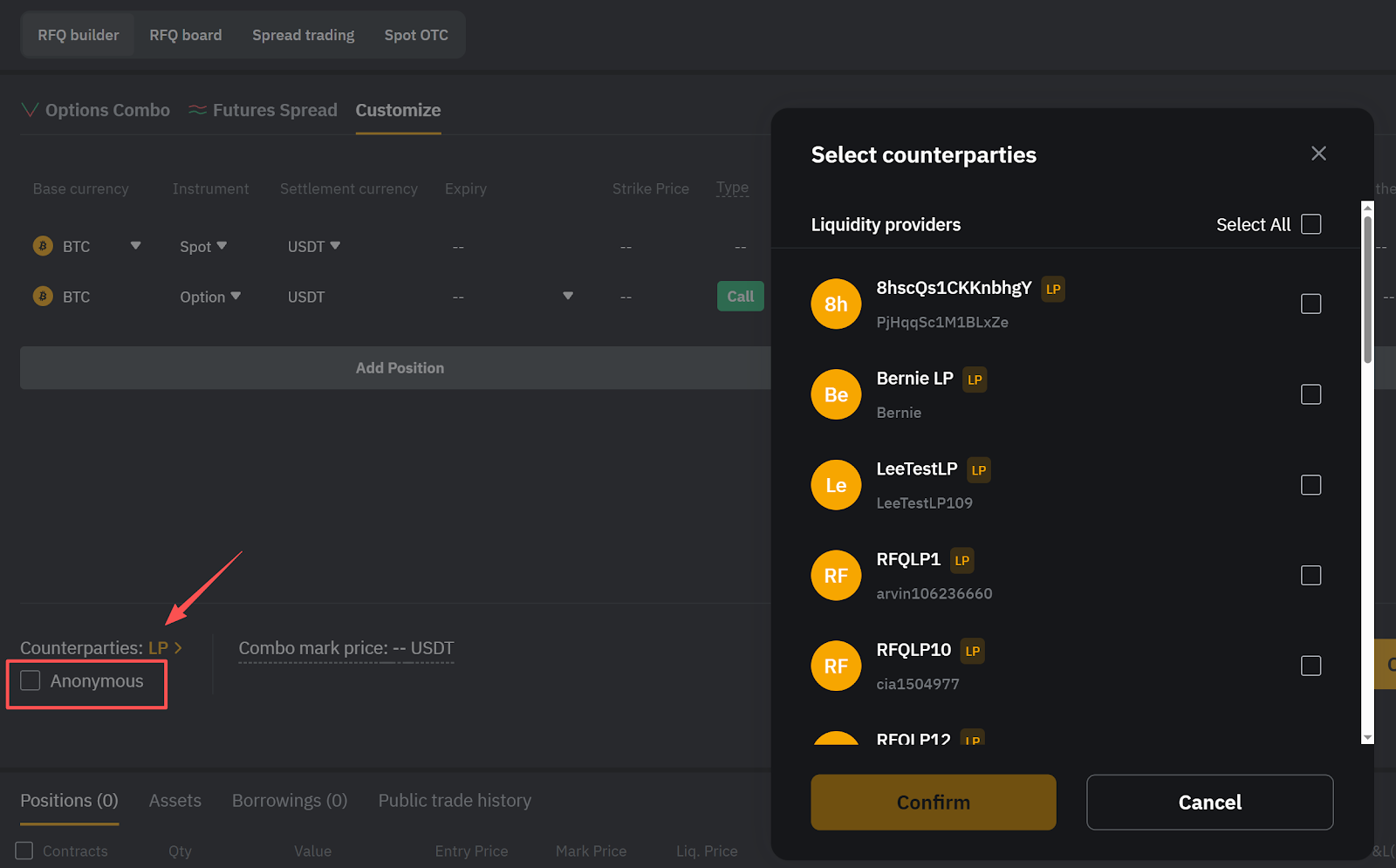 6º passo: Depois de configurar sua estratégia, clique em LP no canto inferior esquerdo para selecionar uma ou mais contrapartes. Para máxima confidencialidade, marque a caixa Anônimo.