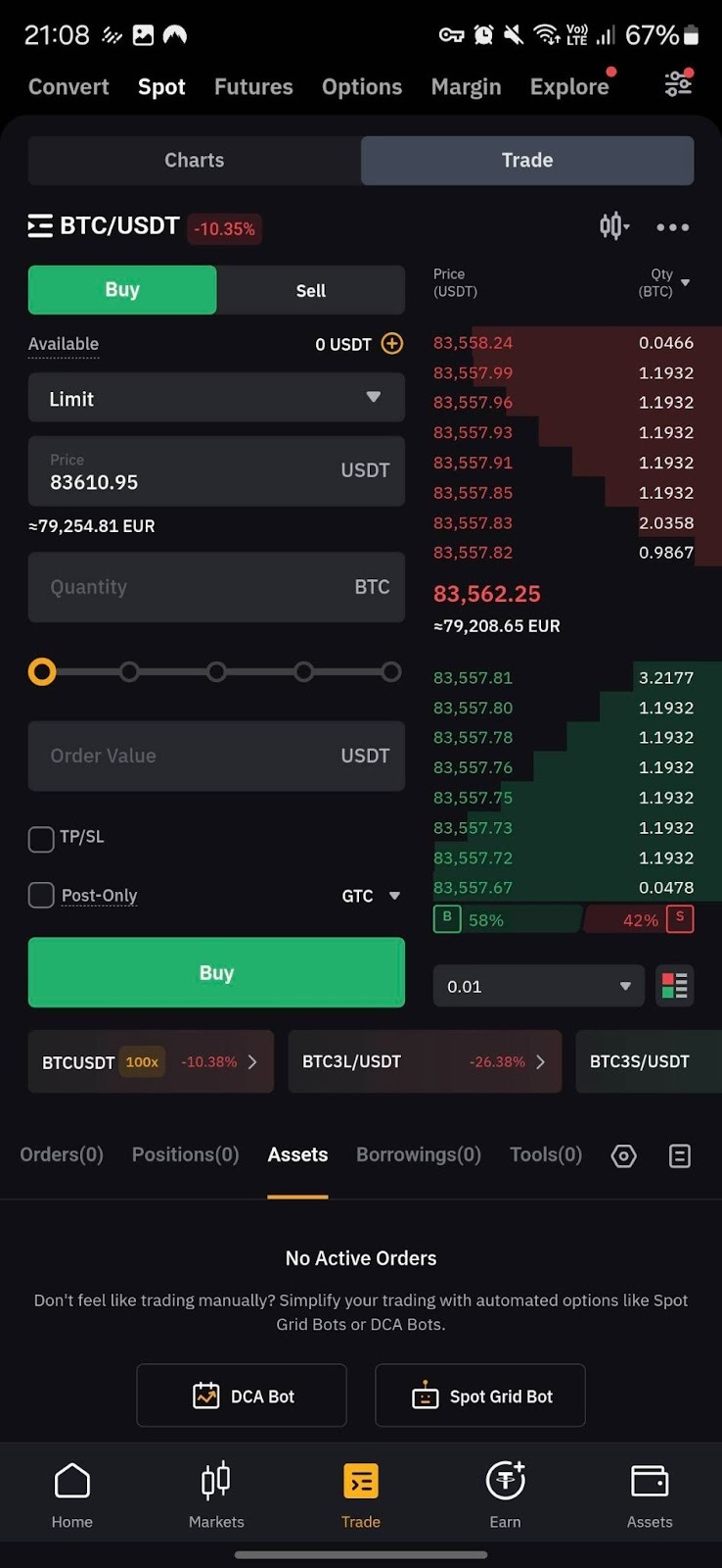 On the Bybit App, go to Trade, open the Spot Trading page and tap on Trade. Tap on the Order History icon on the top right corner of the Position tab section to view your order history and trade history.