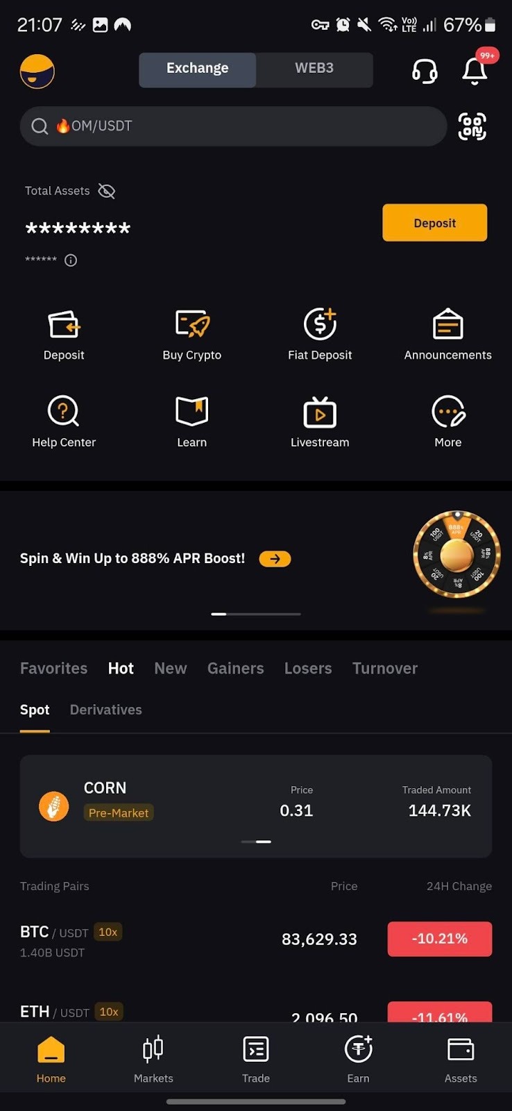 1. Deposit: If your account currently doesn't hold any crypto assets, you can perform a direct deposit of funds.