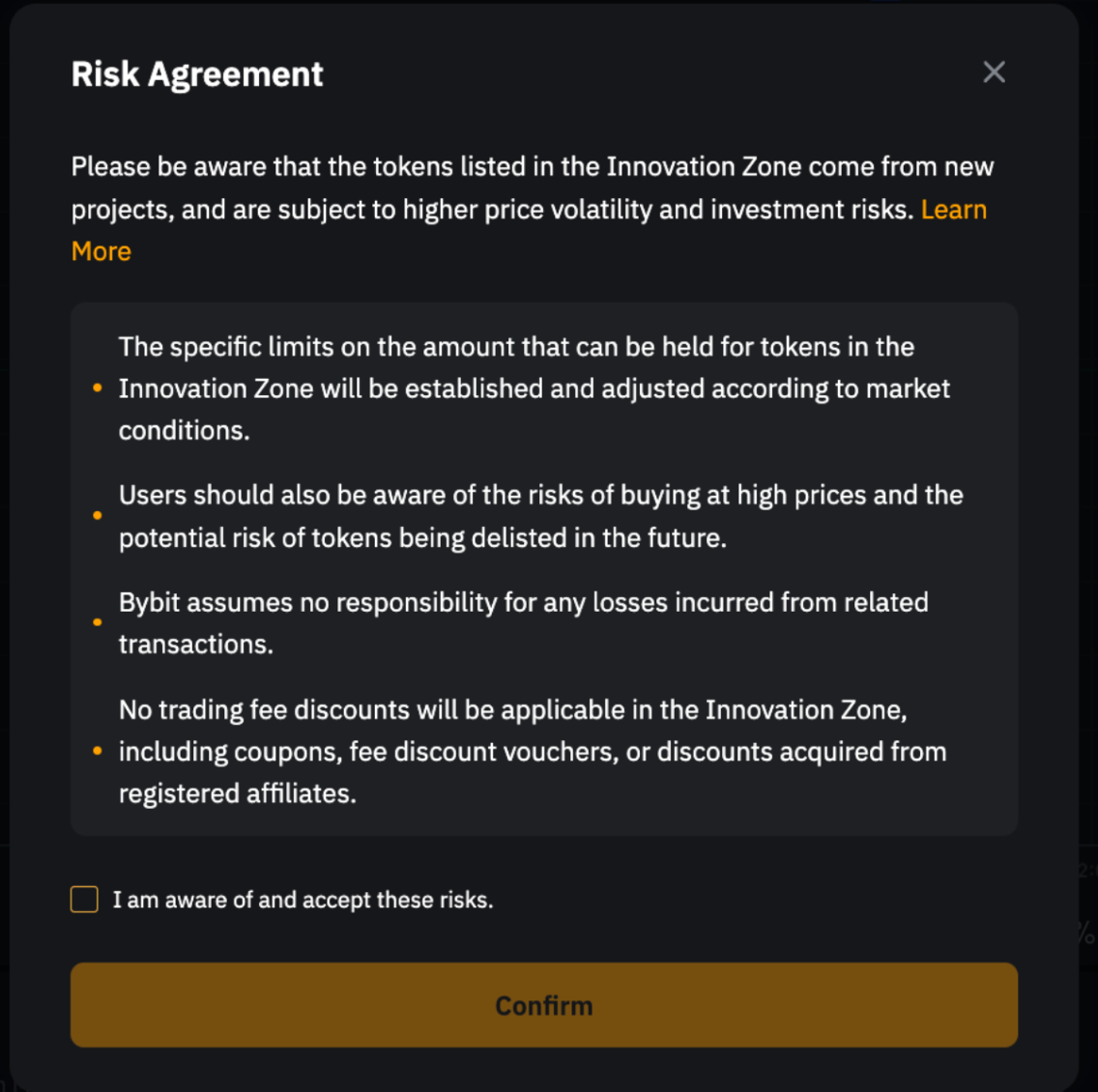 Обратите внимание, что Bybit не несет ответственности за убытки в результате торговли в Зоне инноваций. Мы рекомендуем пользователям тщательно оценивать проекты и риски, а также принимать такие инвестиционные решения, которые соответствуют финансовым возможностям и допустимым рискам.