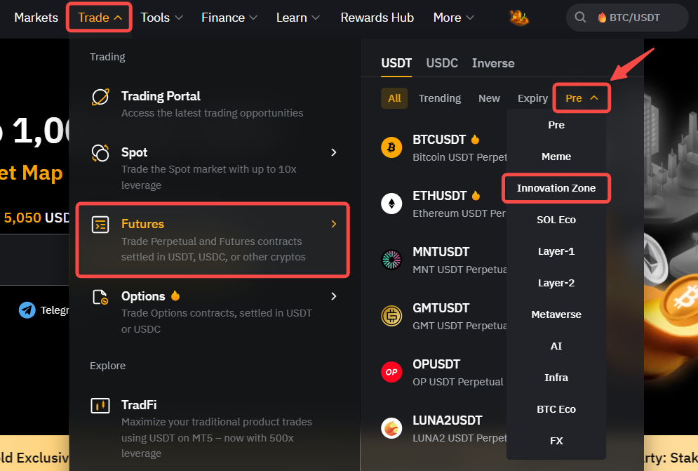 Для доступа к Зоне инноваций и контрактам нажмите ТорговатьФьючерсы и в раскрывающемся меню выберите Зона инноваций.