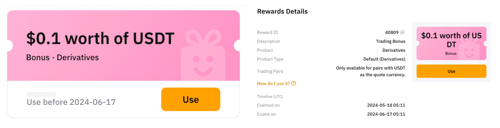 После успешного получения бонуса он будет зачислен на ваш аккаунт, а соответствующая сумма будет видна на торговой странице соответствующего продукта. Бонусы нельзя переводить на другие аккаунты или обменивать на другие активы.