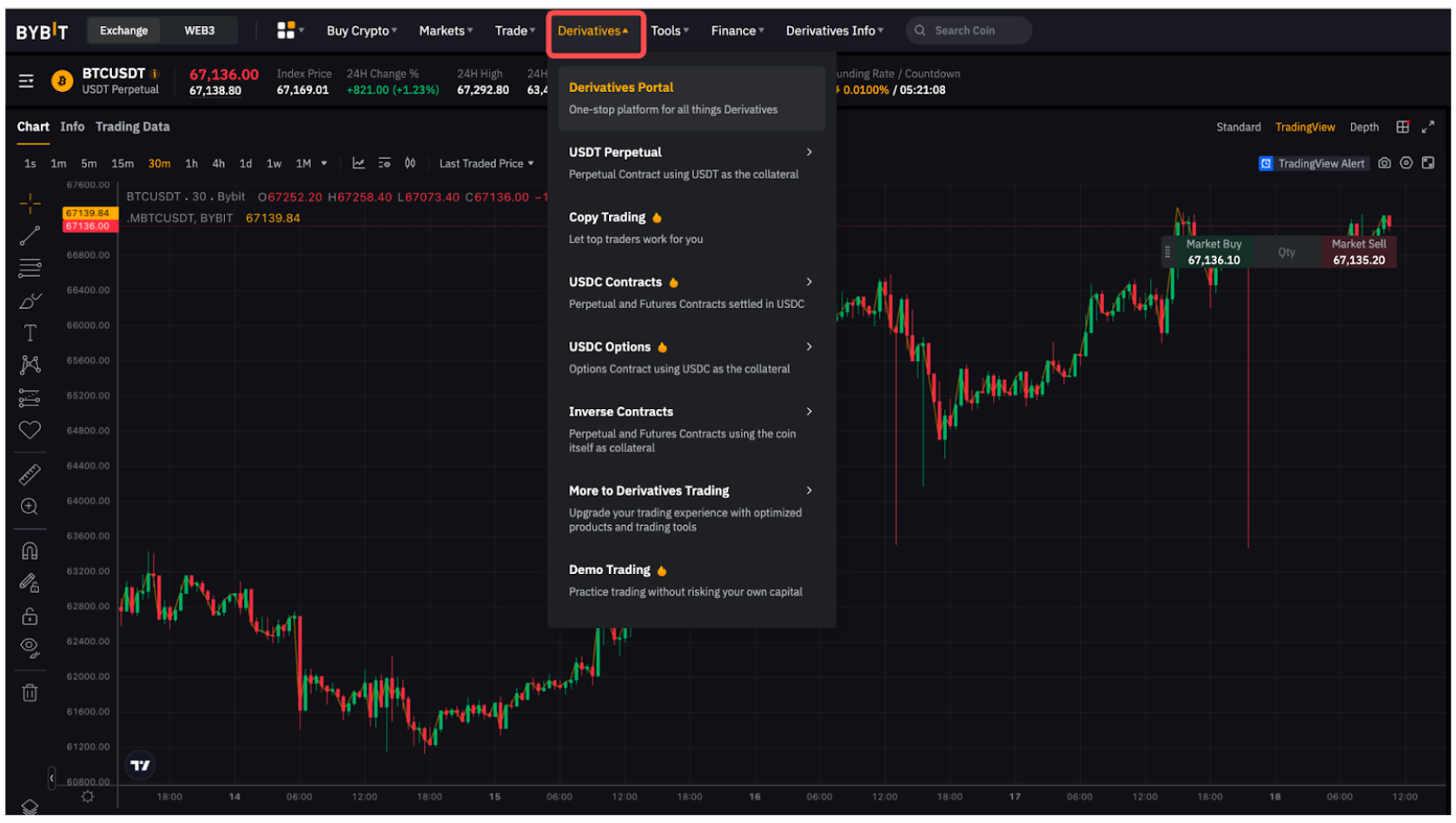 Шаг 1: Наведите курсор на вкладку Деривативы и нажмите на желаемый тип контракта, после чего откроется соответствующий торговый интерфейс.