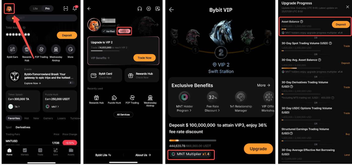 Множитель MNT является преимуществом для держателей MNT, которое ускоряет VIP-прогресс, присваивая дополнительный вес MNT в расчетах стоимости активов. Множитель, основанный на вашем уровне VIP, применяется к вашим акциям MNT, что позволяет вам перейти на более высокие уровни с меньшим общим количеством активов.