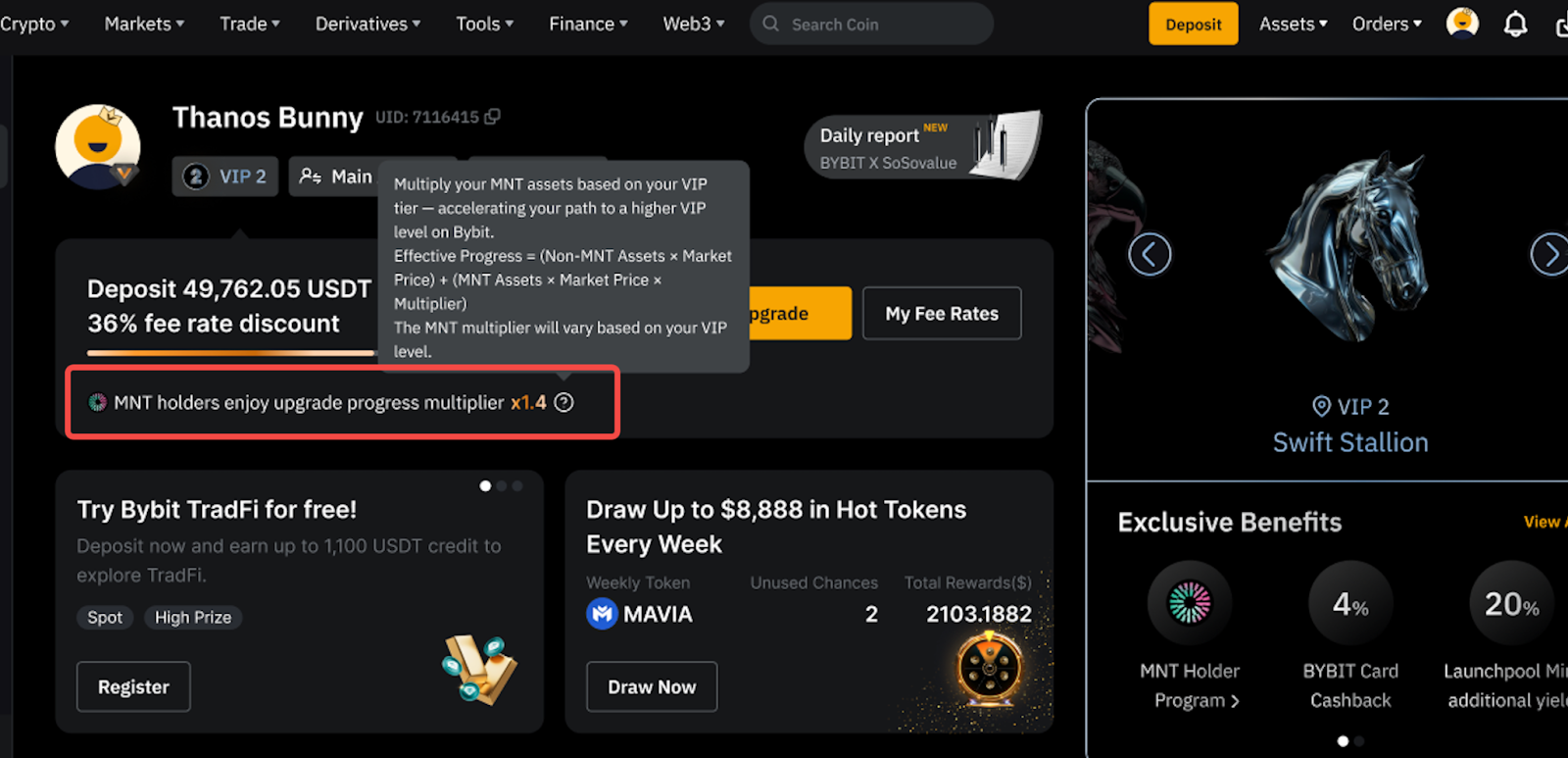 Учреждения, которые имеют больше MNT, могут использовать более высокие возможности для продуктов Bybit: