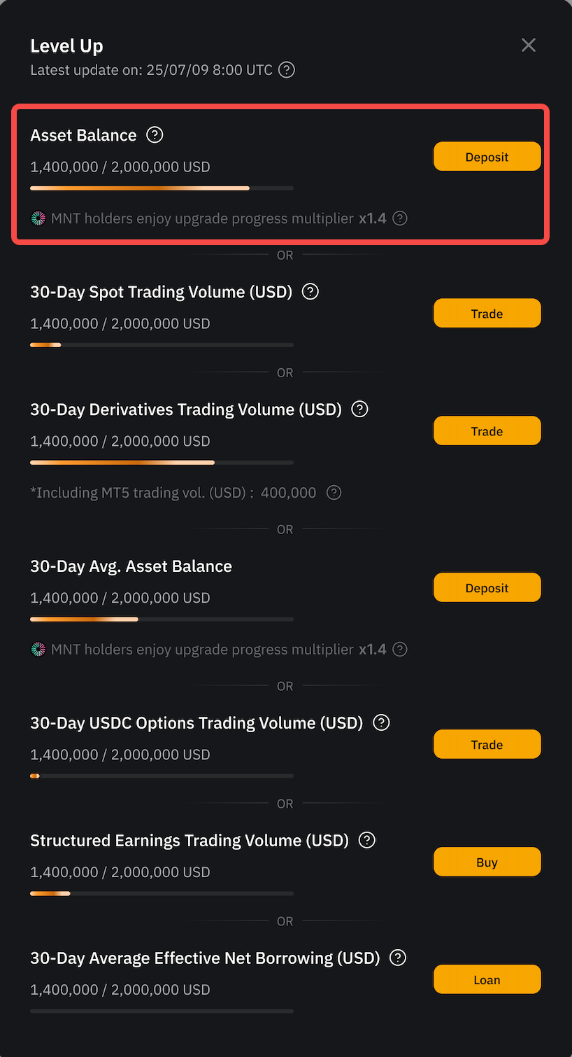 К вашим акциям MNT применяется 1,5-кратный множитель, повышающий стоимость MNT до 97 500 долл. США (65 000 долл. США × 1,5). При добавлении 30 000 USDT общая стоимость вашего актива составит 127 500 долларов США, что позволит вам получить VIP 1.
