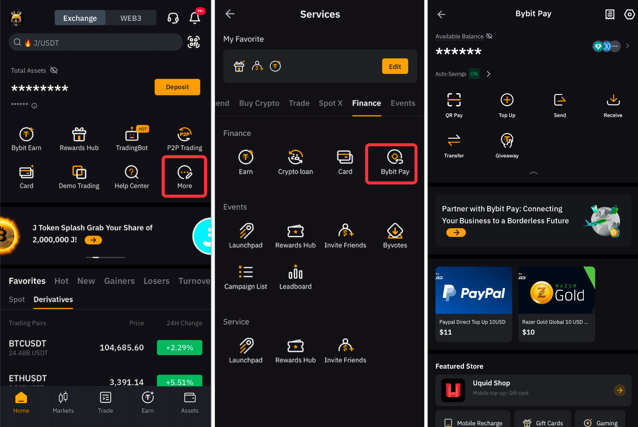 Якщо ви в застосунку Bybit, спершу запустіть застосунок Bybit і увійдіть у свій акаунт. Натисніть Більше на головній сторінці, а потім натисніть Bybit Pay.