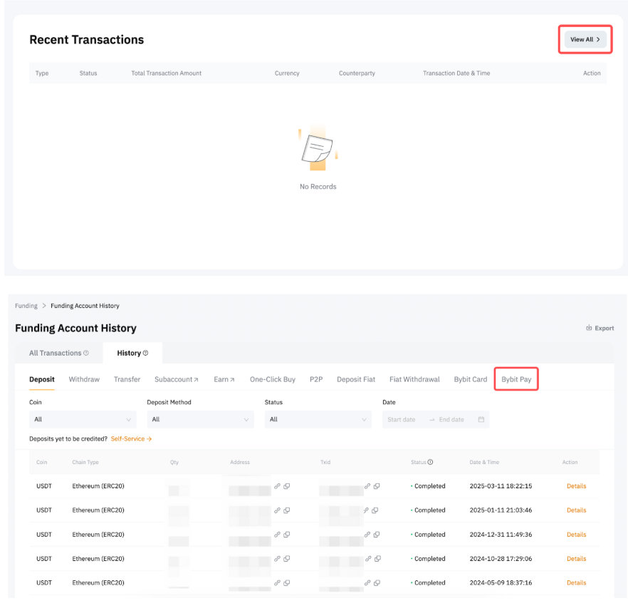 На вебсайті перейдіть на сторінку Bybit Pay, прокрутіть вниз, щоб знайти останні трансакції, і натисніть Переглянути все. Крім того, ви можете знайти історію транзакцій, перейшовши на Акаунт Фінансування → Історія → Bybit Pay.