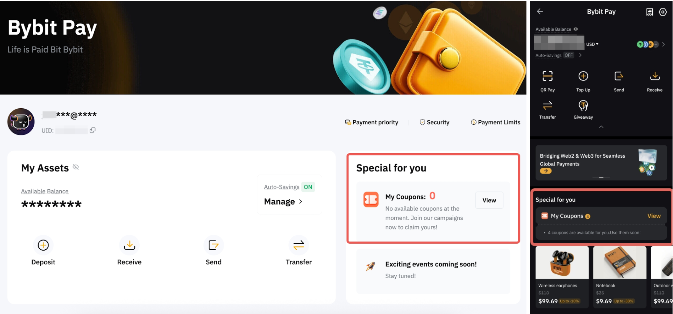 Купони можна використовувати лише при здійсненні платежів торговцям Bybit Pay. Ви можете переглянути доступні купони тут або зайти до Бонусного центру, щоб перевірити, чи не відбувається якась діяльність, щоб отримати винагороди.
