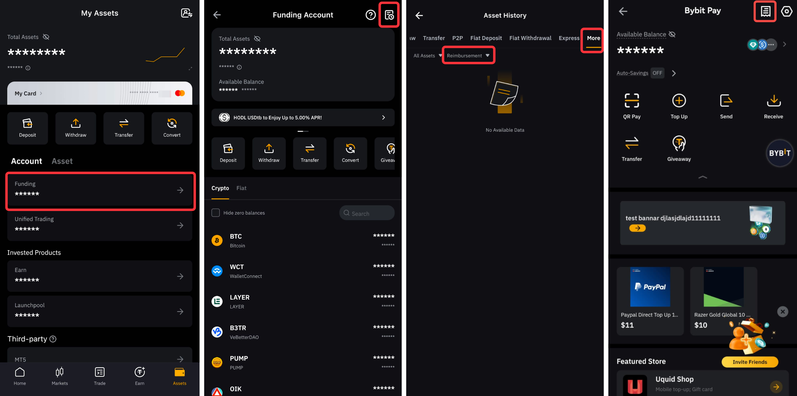 У застосунку перейдіть до Активи → Акаунт Фінансування → Більше, а потім відфільтруйте тип за Bybit Pay. Крім того, ви можете перейти на сторінку Bybit Pay і натиснути на значок Документа у верхньому правому куті.