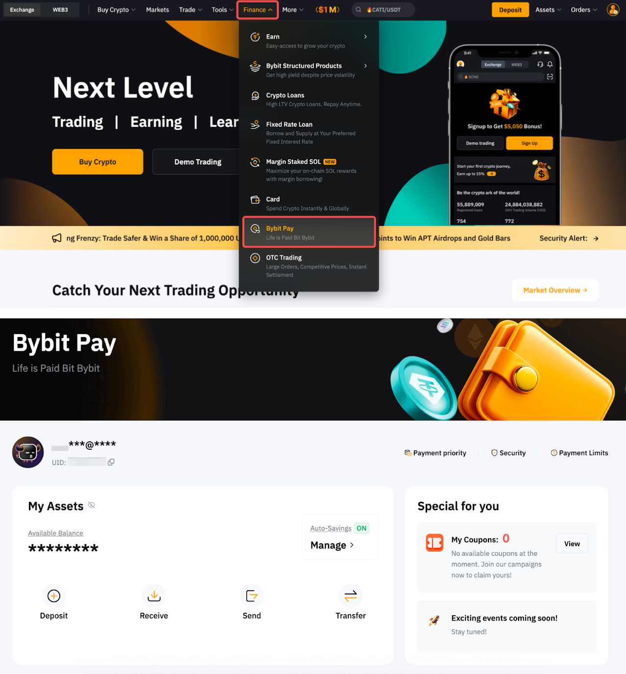 Якщо ви перебуваєте на вебсайті Bybit, натисніть Фінанси та торкніться Bybit Pay.