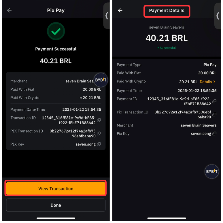 Уся історія транзакцій, включно з PIX Pay за допомогою картки Bybit і Bybit Pay, записується в історію транзакцій Bybit Pay.