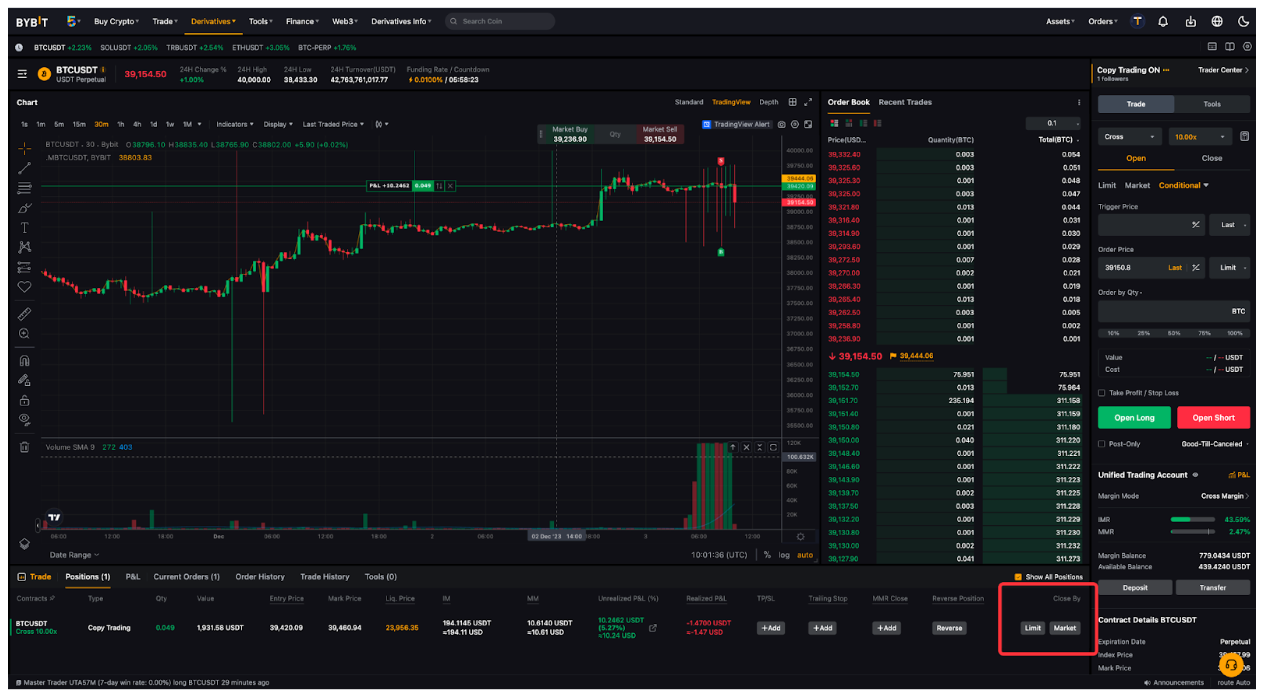 Щоб закрити позицію, перейдіть на вкладку Позиції, і ви зможете закрити лімітним ордером або ринковим ордером. Якщо ви хочете закрити за допомогою інших стратегій, як-от умовний ордер, ви можете або використовувати вбудовану функцію TP/SL (для режиму хеджування), або розмістити його із зони ордера в односторонньому режимі.