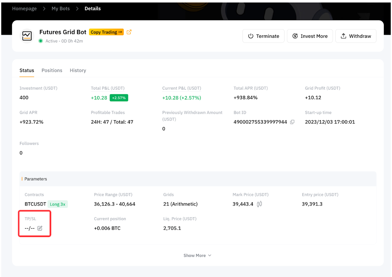 Якщо ви встановите TP/SL за %, коли поточний P&L досягне встановленого відсотка, ваш бот припинить роботу, а ваша позиція буде закрита за ринковою ціною.