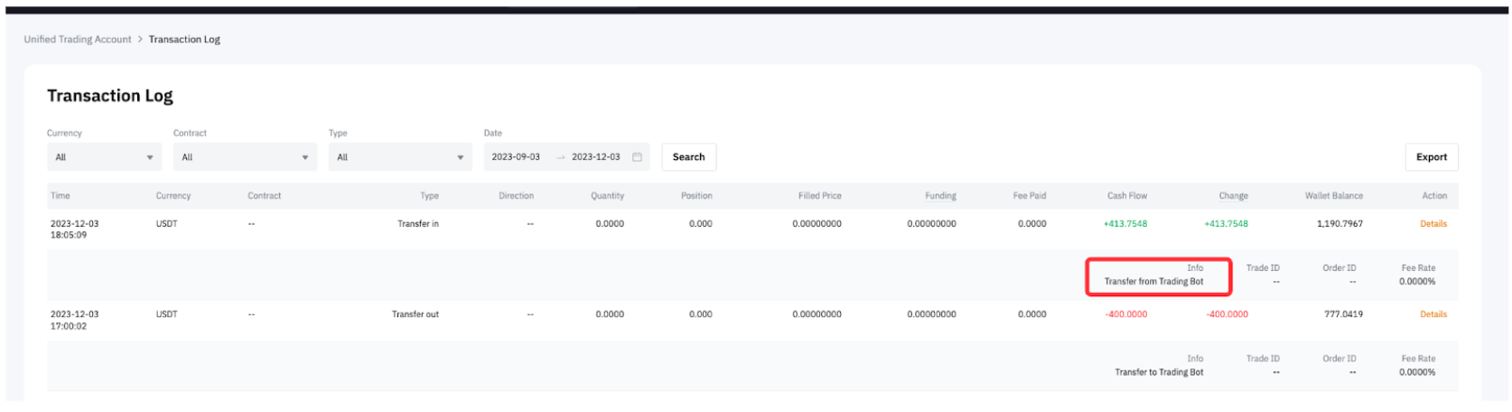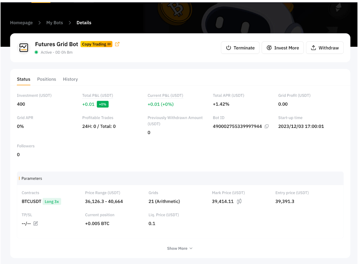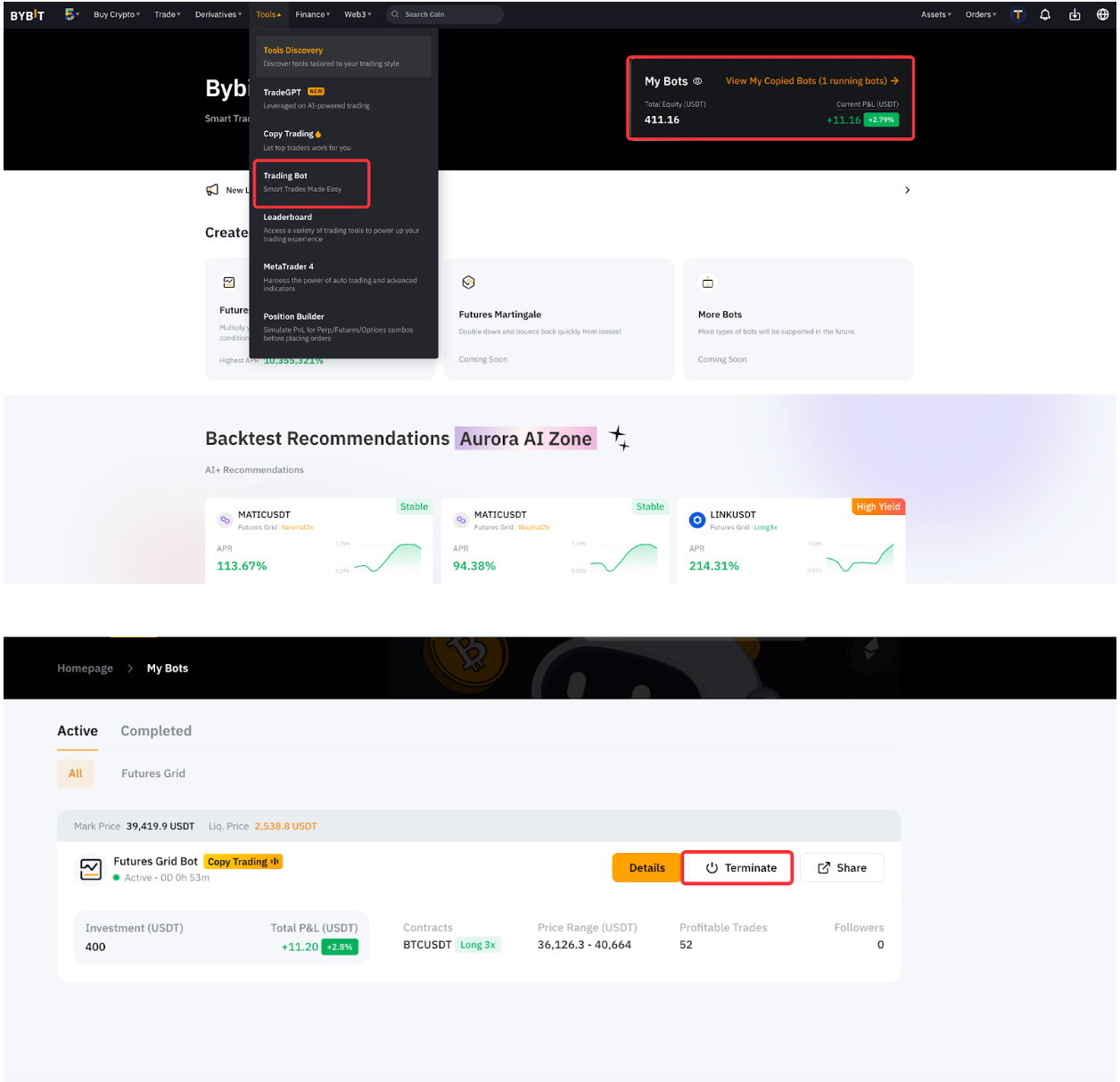 Щойно ви припините роботу бота, усі невиконані ордери в боті буде скасовано, а позиції закрито за поточною ринковою ціною. Кошти будуть повернені на ваш єдиний торговий акаунт (для користувачів UTA) або деривативний акаунт.