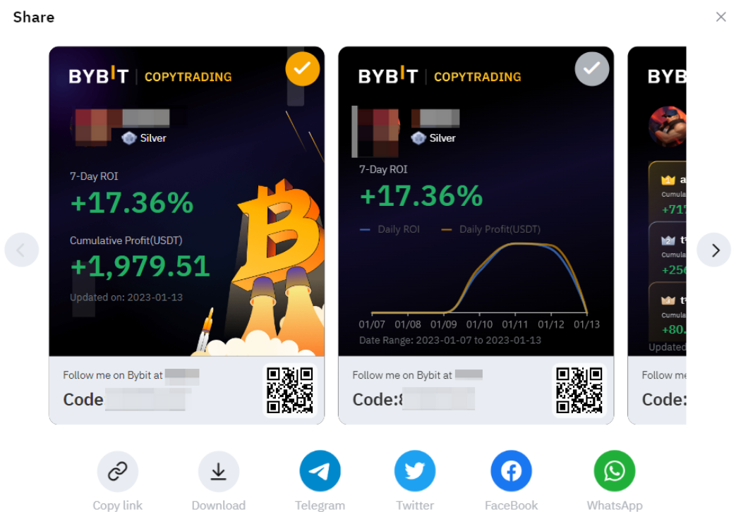 Це дає вам змогу одним натисканням ділитися своїми торговими показниками в соціальних мережах, як-от Telegram, Twitter, Facebook і WhatsApp.