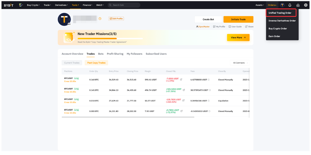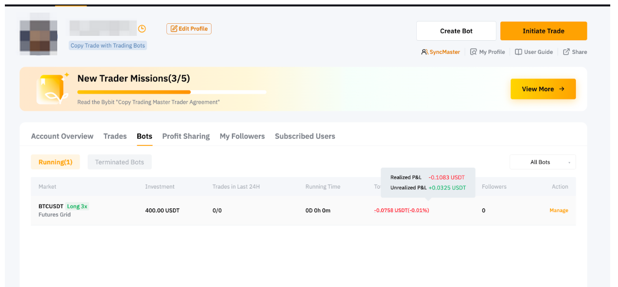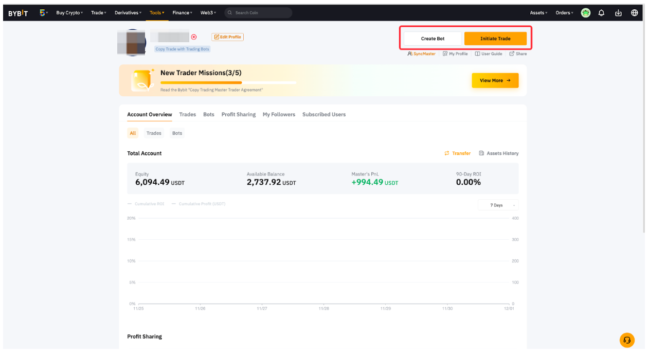 Крок 3. Натисніть Створити бота або Ініціювати угоду праворуч від Центру користувача (майстер-трейдер). Вас буде переспрямовано на сторінку створення торгового бота або сторінку торгівлі USDT безстроковими відповідно. Наразі в копітрейдингу підтримуються лише безстрокові контракти з USDT та ф’ючерсні грід-боти.