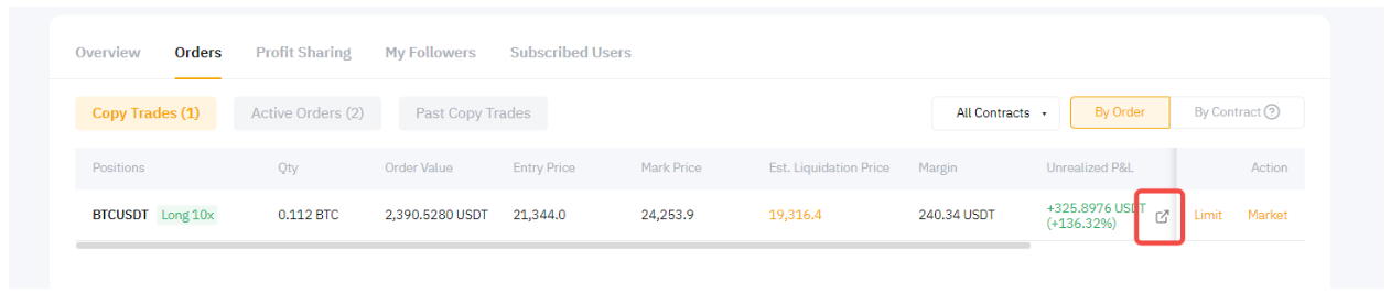 На сторінці «Центр користувача» можна переглянути деталі ордера За ордером або За контрактом. На вкладці За ордером відображаються ордери, розміщені кожним відповідним майстер-трейдером. На вкладці За контрактом усі ордери для однакових торгових пар, відкритих в одному напрямку, об’єднані в одну позицію. Середня ціна входу, кількість ордера, ціна маркування та ціна ліквідації для позиції відображаються з перспективи позиції. Її буде скинуто лише тоді, коли відповідний напрямок позиції буде повністю закрито.