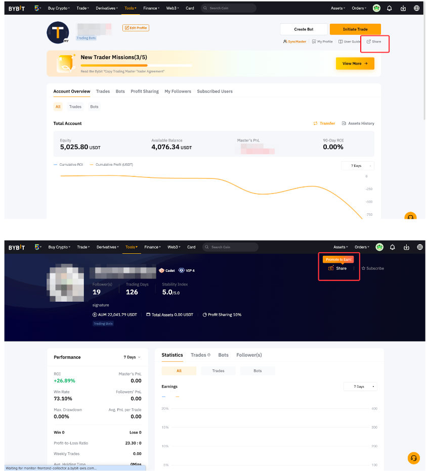 Щоб поділитися своїм профілем, натисніть кнопку Поділитися у верхньому правому куті сторінки центру користувача копітрейдингу. Ви також можете натиснути Поділитися на сторінці Профіль майстер-трейдера.