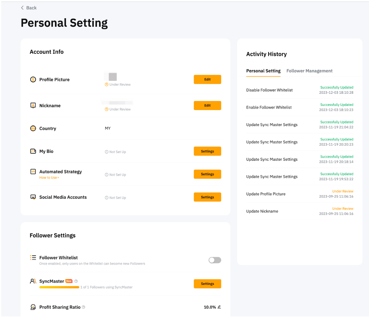 Щоб перейти на сторінку персональних налаштувань, натисніть Мій копітрейдинг → Редагувати профіль, щоб керувати інформацією акаунта, налаштуваннями підписників і налаштуваннями конфіденційності. Зверніть увагу, що для схвалення будь-яких оновлень інформації акаунта потрібно 1–3 робочих дні.