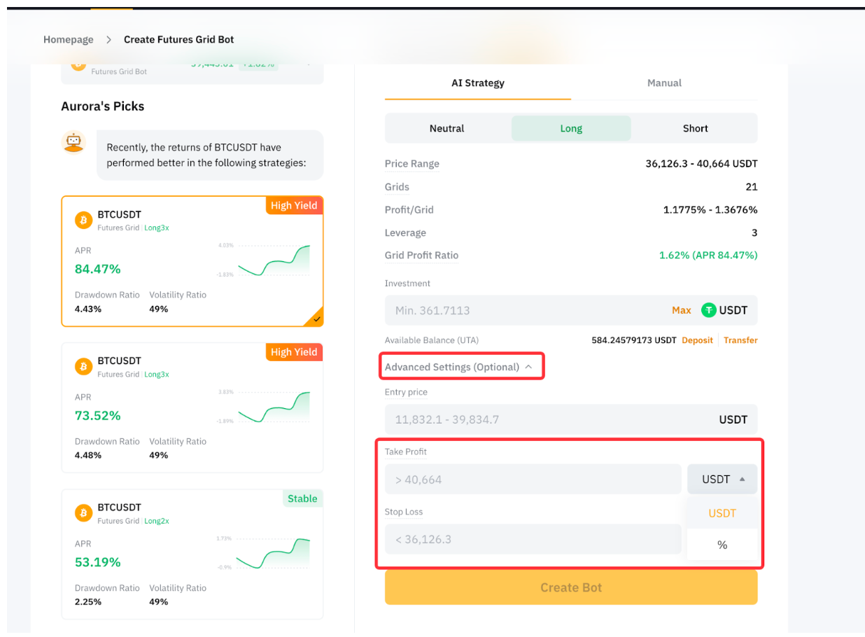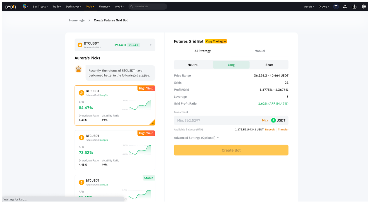 Торговий бот. Після натискання кнопки Створити бота вас буде переспрямовано на сторінку створення ф’ючерсного грід-бота. Ви можете дотримуватися запропонованих стратегій бота, створених за допомогою Aurora AI, або налаштувати параметри свого бота праворуч. Докладніше про ф’ючерсного грід-бота див. тут.