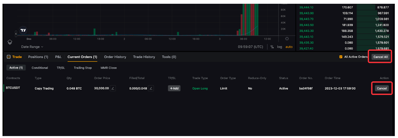 Щоб скасувати ордер, перейдіть на вкладку Поточні ордери на сторінці «Торгівля безстроковими контрактами».