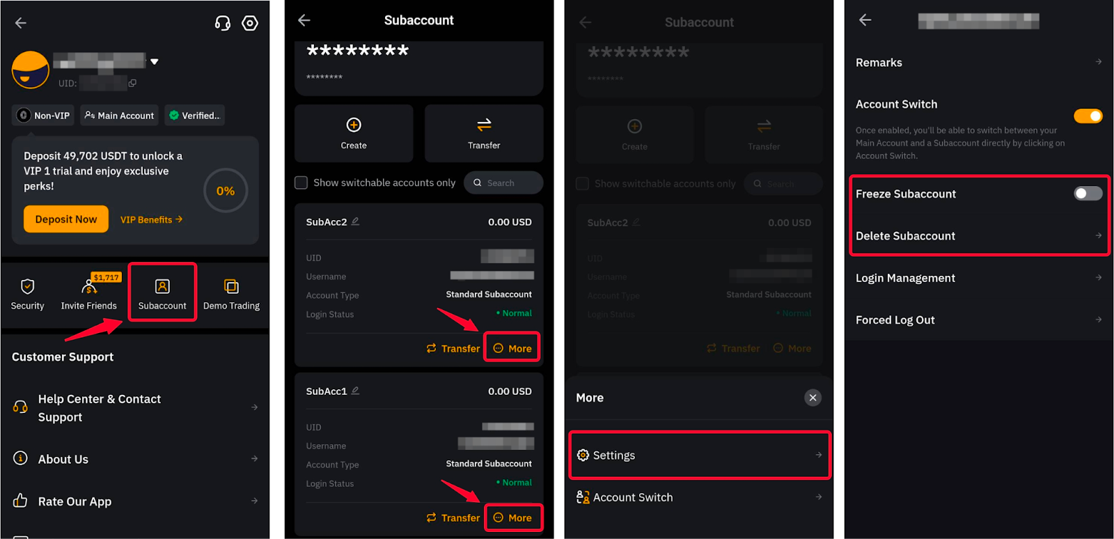 Щоб видалити/заморозити субакаунт, потрібно відкрити вкладку Субакаунт, натиснувши зображення профілю у верхньому лівому куті. Натисніть кнопку Більше відповідного субакаунта, відкрийте Налаштування та натисніть Заморозити субакаунт або Видалити субакаунт.
