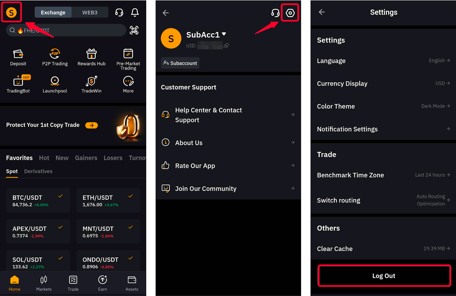 Після входу на сторінці входу Bybit ви можете вийти з субакаунта, торкнувшись зображення профілю на головній сторінці, відкривши сторінку налаштувань і прокрутивши вниз до кінця меню, щоб натиснути кнопку Вийти.