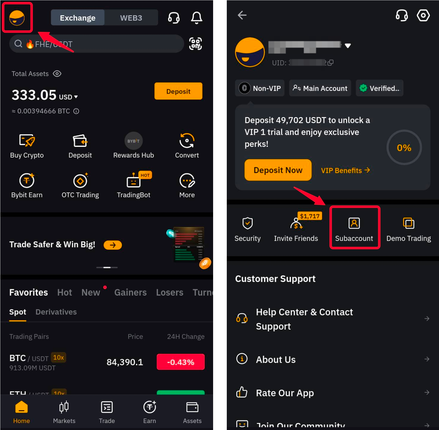 Крок 1. Увійдіть у застосунок Bybit і торкніться значка профілю у верхньому лівому куті, щоб отримати доступ до вкладки Субакаунт.