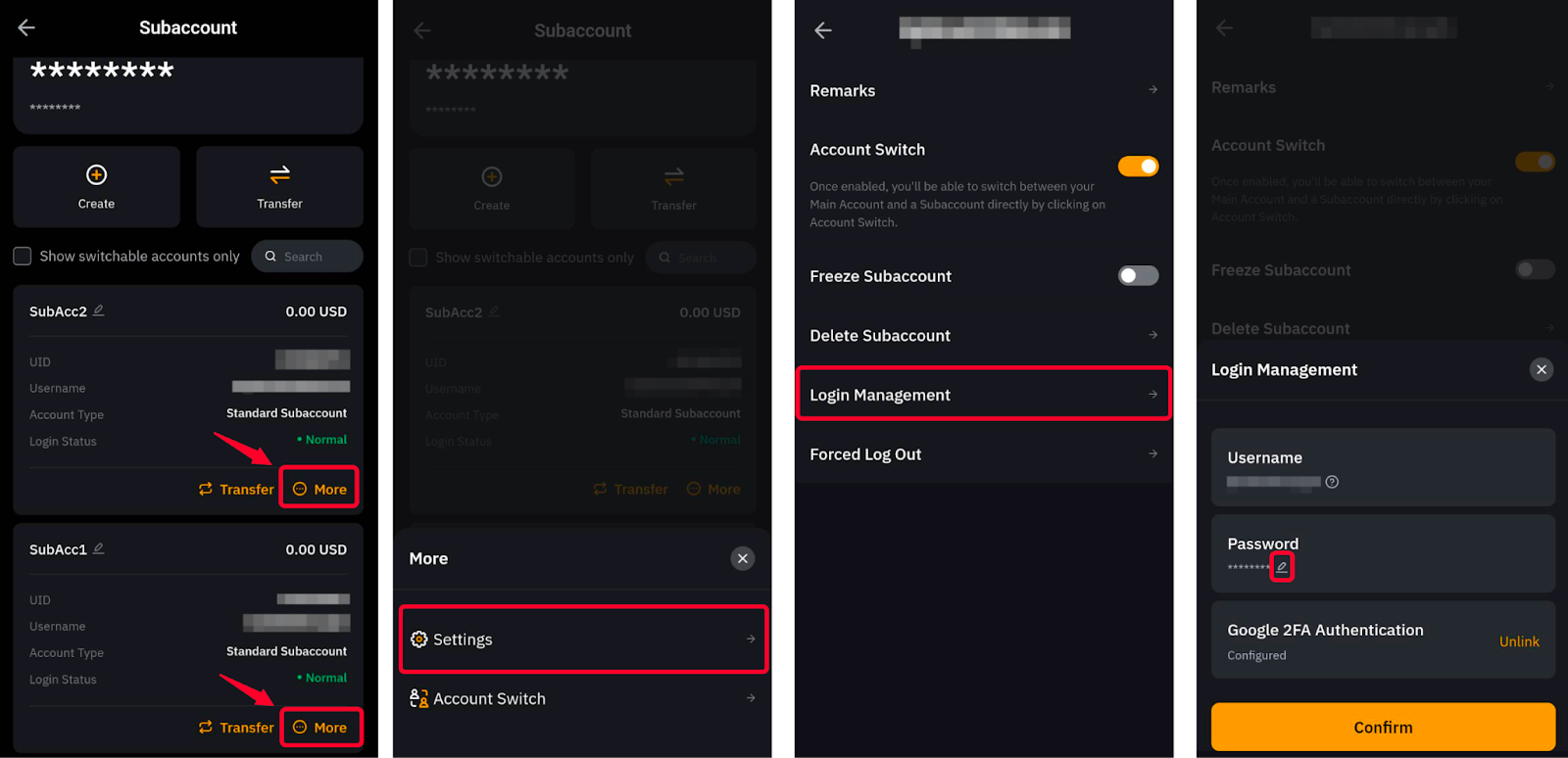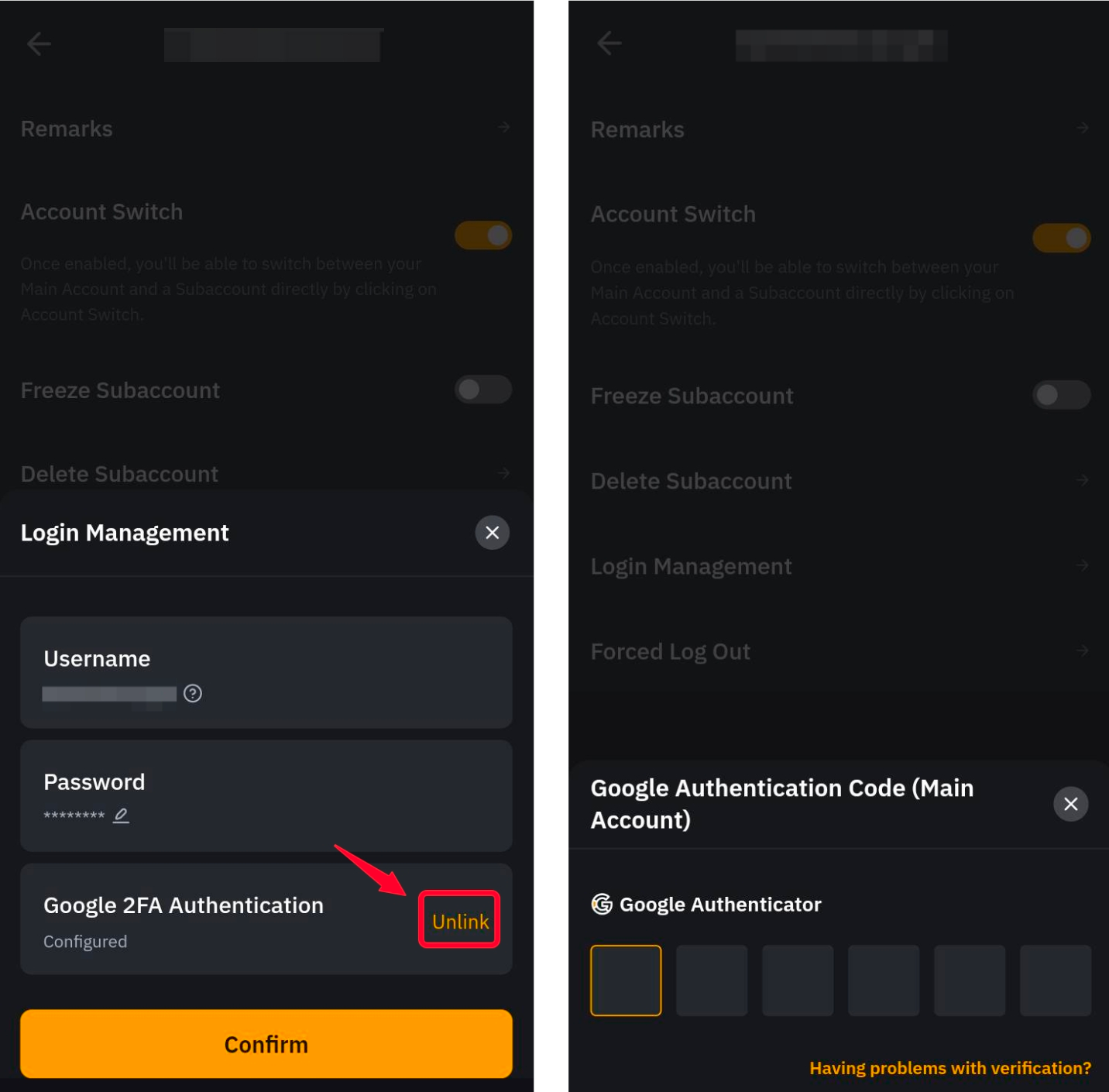 Щоб вимкнути Google Authenticator у субакаунті, потрібно відкрити вкладку Субакаунт, натиснувши зображення профілю у верхньому лівому куті. Натисніть кнопку Більше відповідного субакаунта та натисніть Налаштування → Керування входом → Від’єднати.