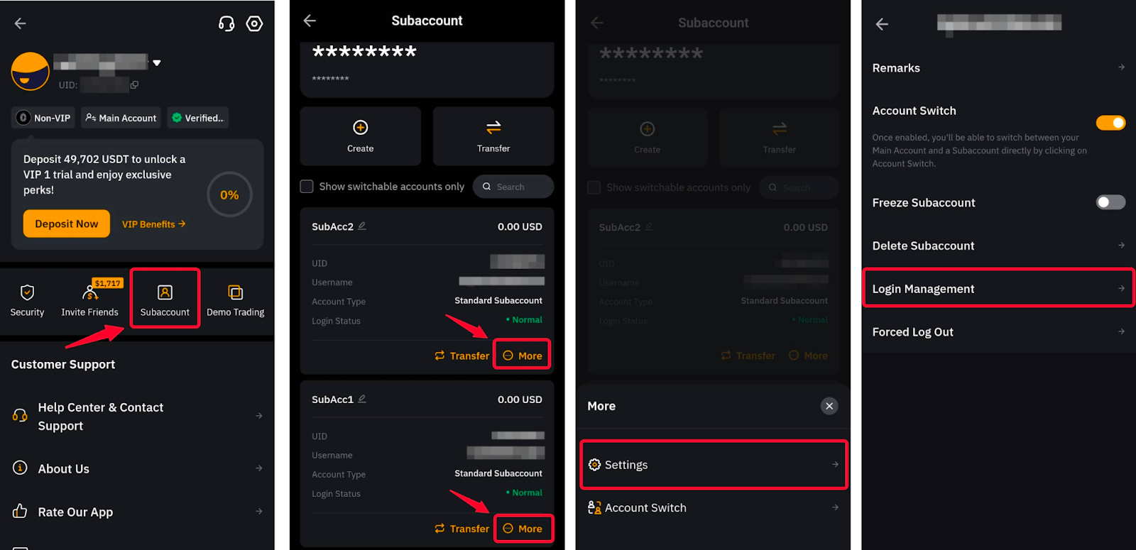 Зверніть увагу, що якщо ви спочатку створили стандартний субакаунт без налаштувань пароля, ви можете ввійти лише через перемикач акаунта з основного акаунта. Щоб активувати вхід на сторінці входу Bybit, підключіться до свого основного акаунта, а на сторінці субакаунта знайдіть субакаунт і торкніться Більше → Налаштування → Керування входом. Тепер ви можете відновити ім’я користувача субакаунта та встановити новий пароль.
