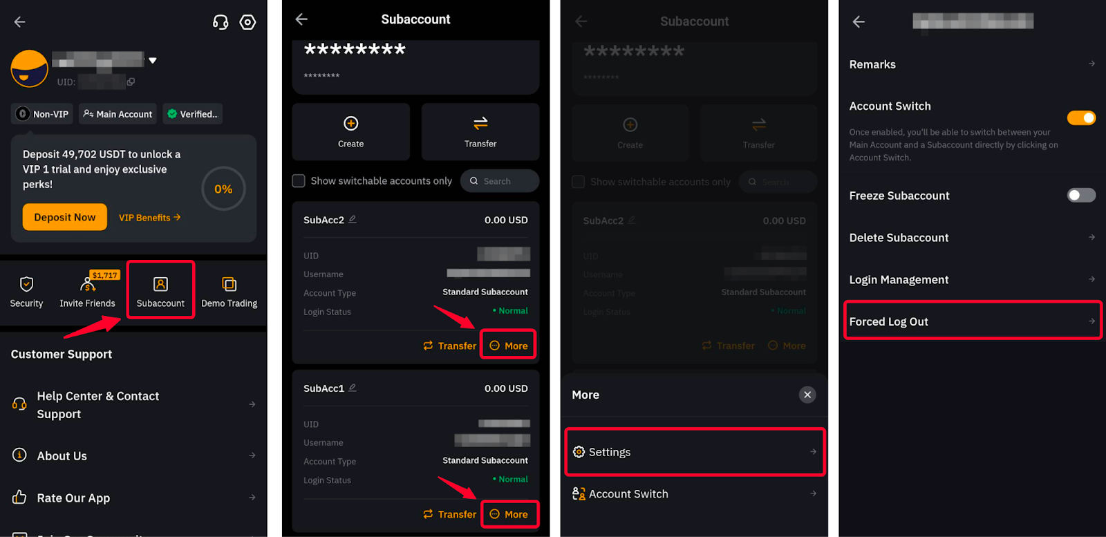 У головному акаунті ви також маєте можливість вийти з субакаунта на інших пристроях за допомогою кнопки Примусовий вихід із системи, доступної для кожного субакаунта, натиснувши Більше → Налаштування → Примусовий вихід.