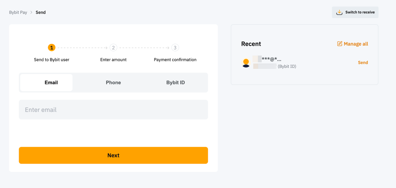 Bybit Pay дає змогу здійснювати транзакції з іншими користувачами та продавцями Bybit Pay. Наразі підтримуються два типи способів надсилання: через Bybit QR-Pay за допомогою застосунку та внутрішній переказ за допомогою застосунку та вебсайту.