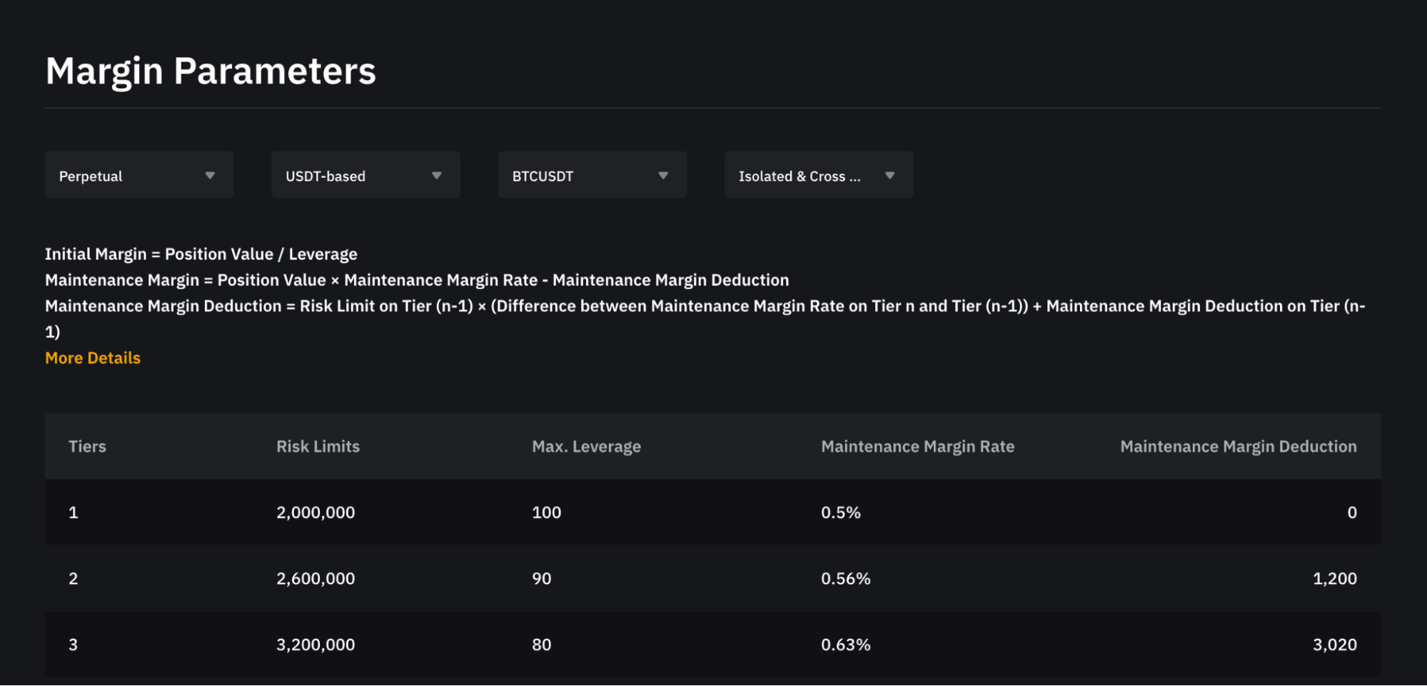 У міру збільшення вартості позиції система автоматично коригує ліміт ризику користувача на основі вартості позиції та активного ордера. Отже, вимоги до підтримувальної маржі та початкової маржі також будуть відповідним чином змінені. У випадках, коли користувачі не мають активних ордерів або позицій, ліміт ризику за замовчуванням встановлюється на найнижчий рівень.