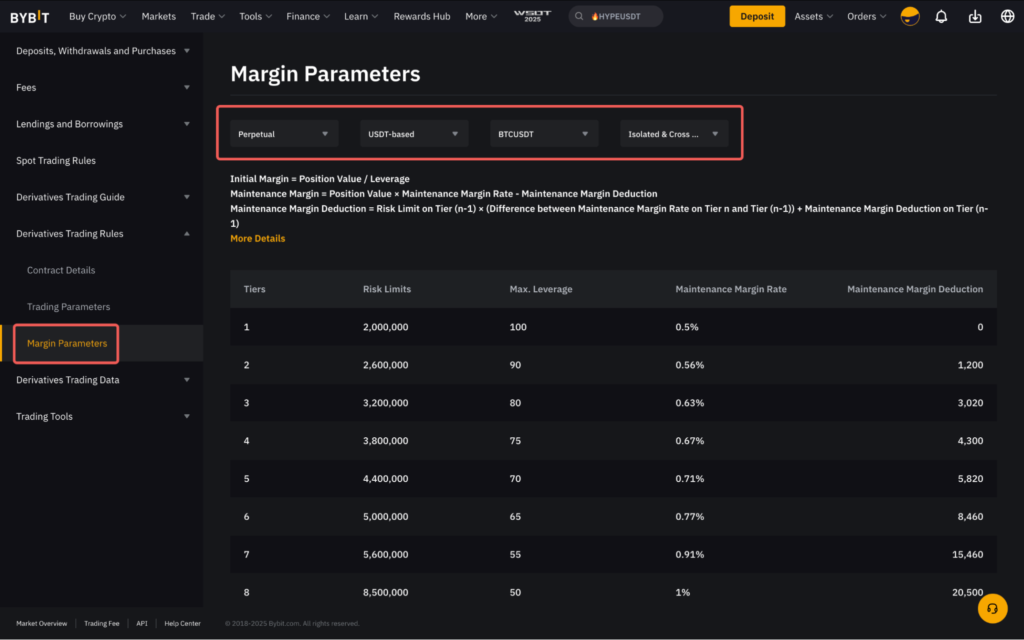Bybit проводить стандартну оцінку ринкової ліквідності. У разі суттєвих змін ринкових умов, ліміт ризику може бути змінено, і це вплине на певні параметри ризику, зазначені нижче: