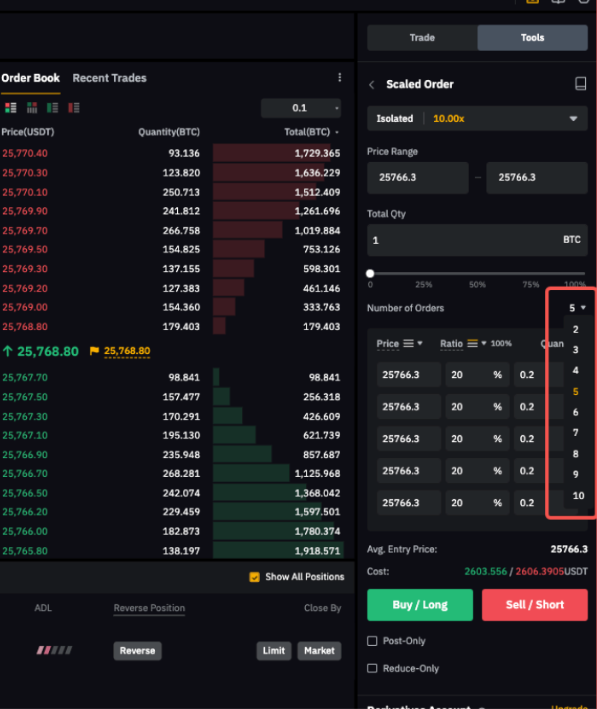 Зверніть увагу, що мінімальна та максимальна загальна кількість для масштабованого ордера в 10 разів перевищує мінімальний та максимальний розміри ордера. Наприклад, мінімальний і максимальний розмір замовлення для BTCUSDT становить 0,001 BTC і 100 BTC відповідно. Як наслідок, мінімальна та максимальна загальна кількість ордера для масштабованого ордера становитиме 0,01 BTC та 1000 BTC відповідно.