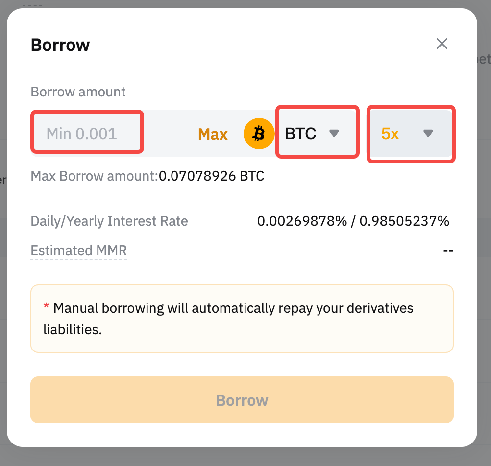 - Bạn phải bật tài sản đã vay làm tài sản đảm bảo trước khi có thể vay. Tài sản có được thông qua Vay Thủ Công sẽ tự động được dùng để hoàn trả bất kỳ khoản nợ Phái Sinh nào chưa thanh toán.
