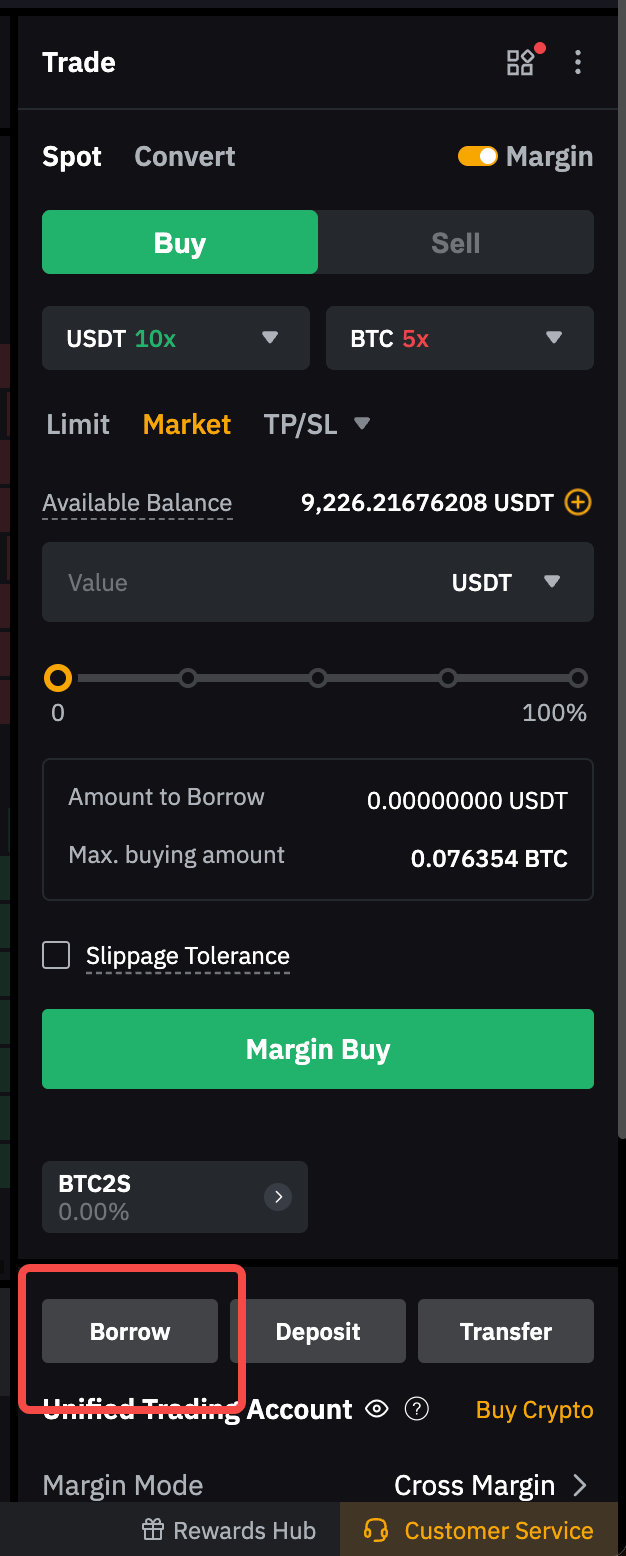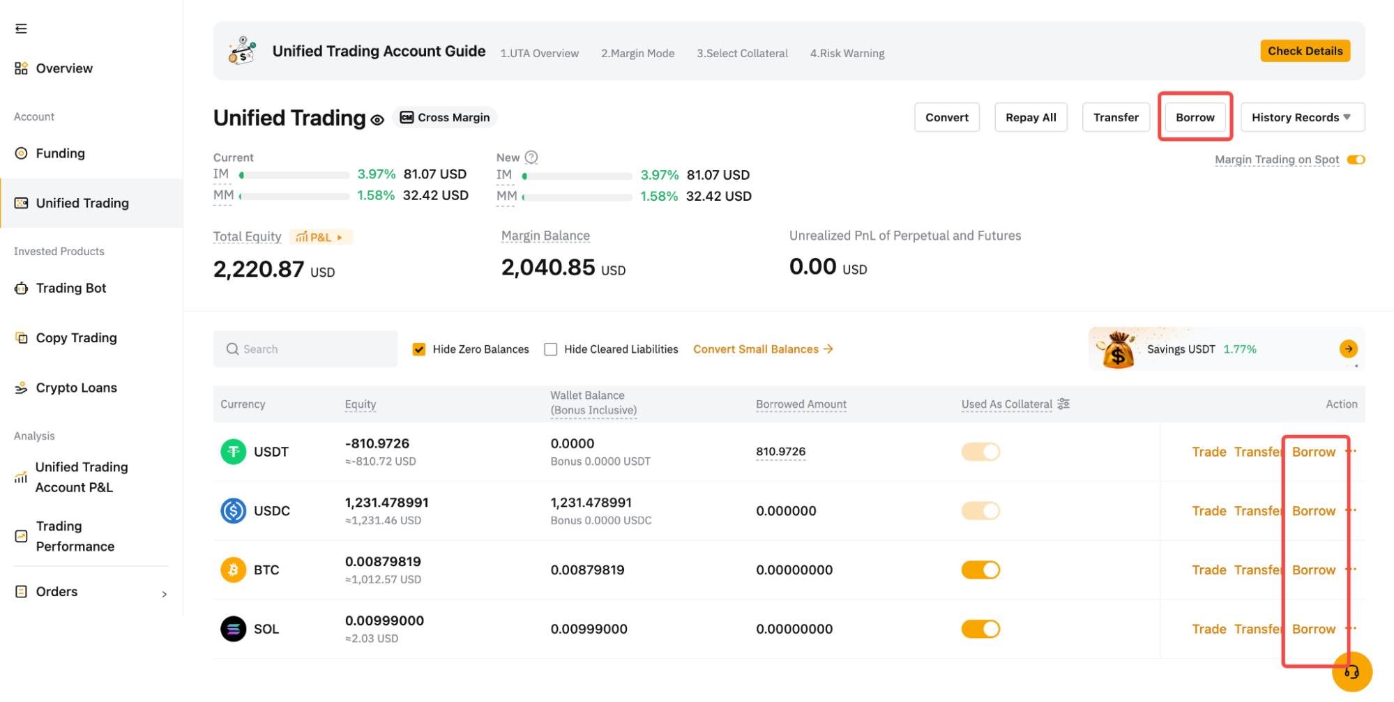 Vay trực tiếp từ trang Giao Dịch Ký Quỹ Giao Ngay hoặc trang tài sản Tài Khoản Giao Dịch (UTA). |